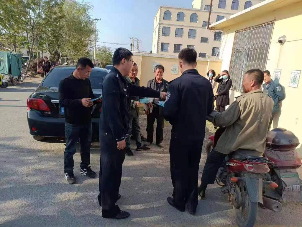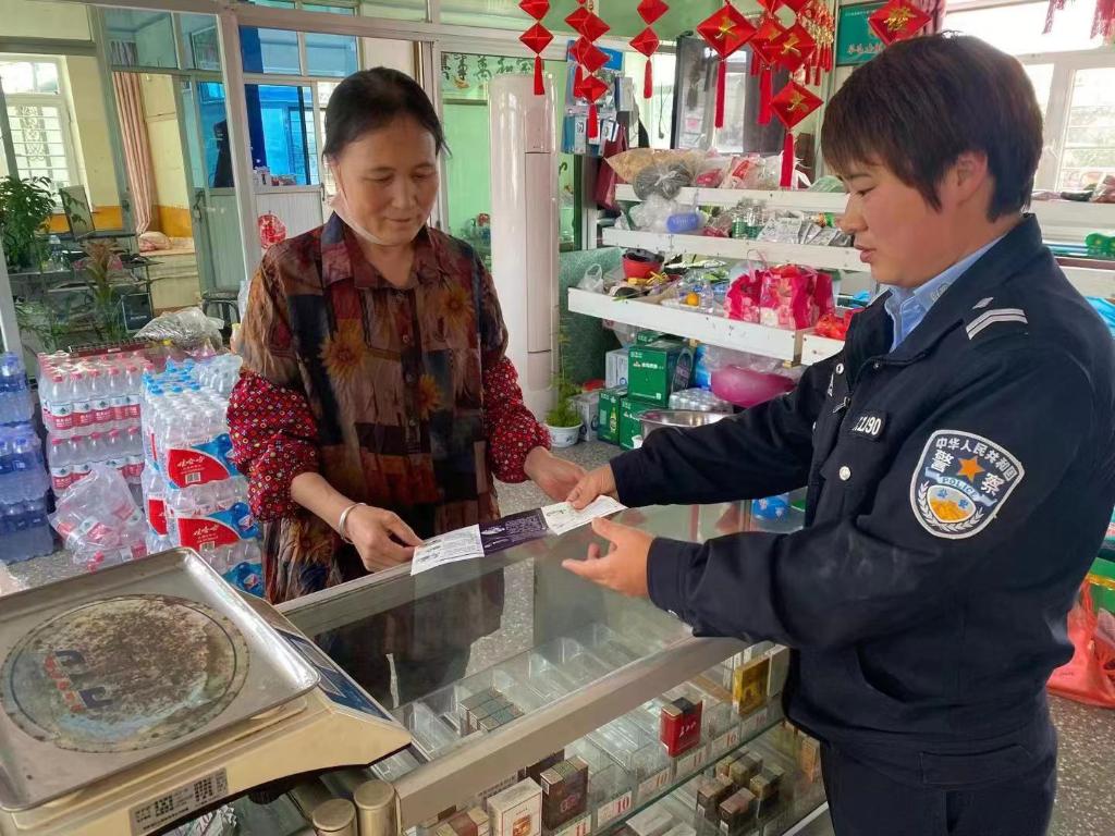 驻村辅警在向村民发布宣传单(图片由盖州市公安局提供)