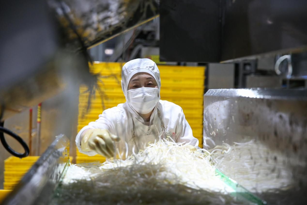 图为福来食品生产车间工人在清洗豆芽。