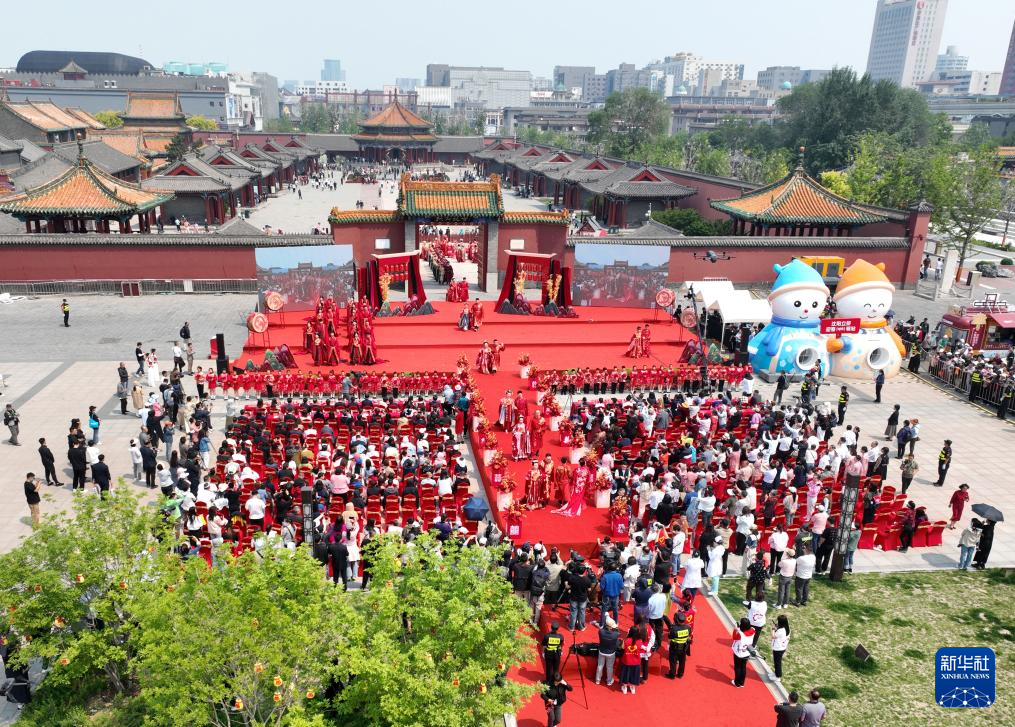 这是5月22日在沈阳故宫南广场拍摄的集体婚礼(无人机照片)。