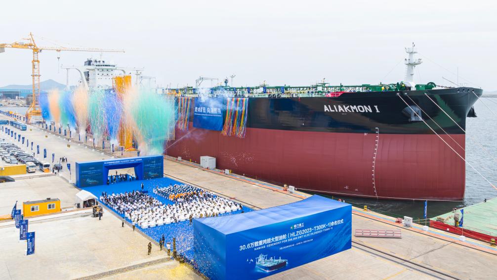 新华网大连6月25日电(记者郭翔)24日,恒力重工举行首制30.6万载重吨超大型油轮(VLCC)命名仪式,该轮被命名为“ALIAKMON Ⅰ”号。