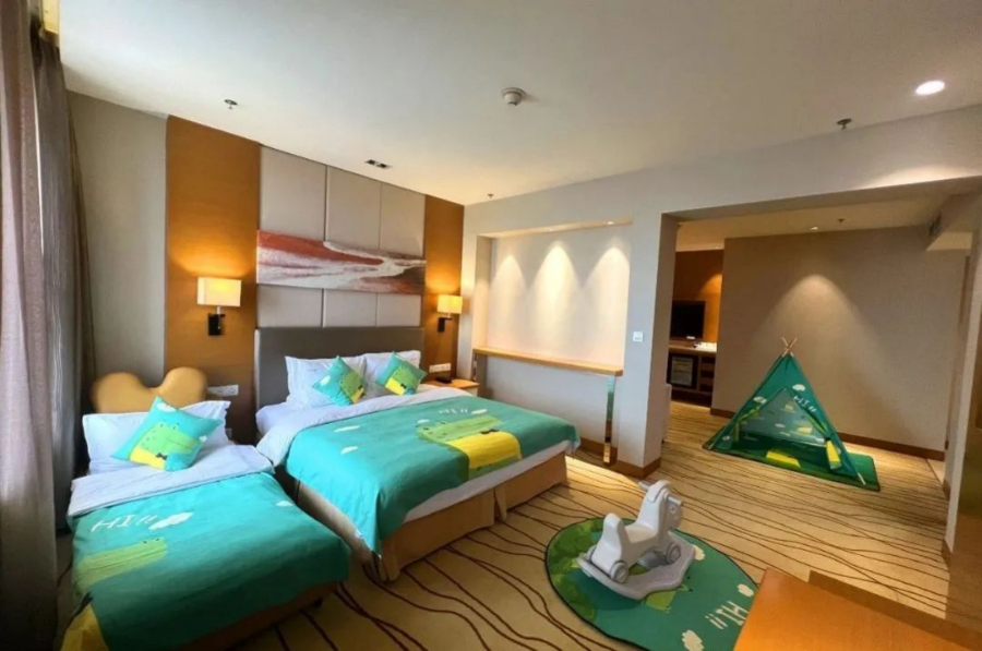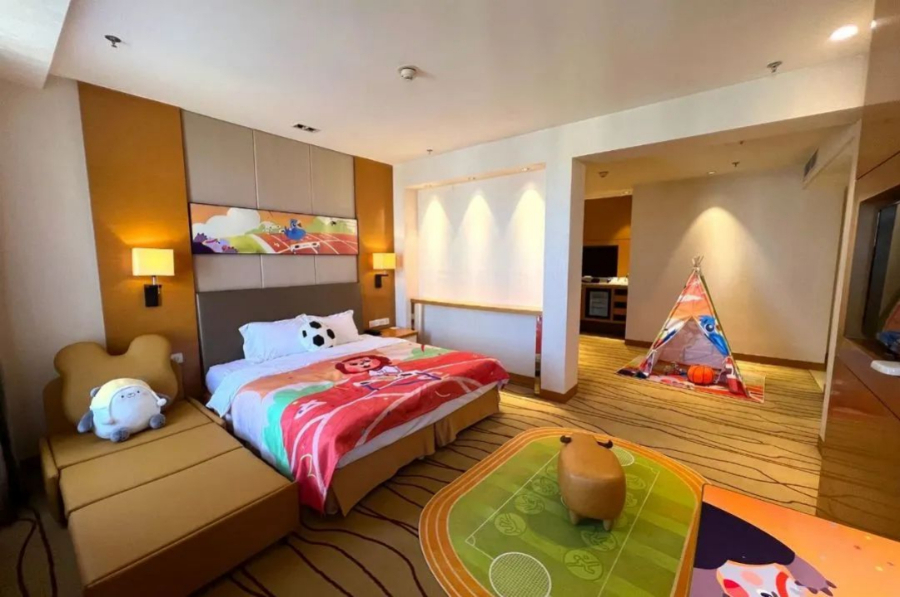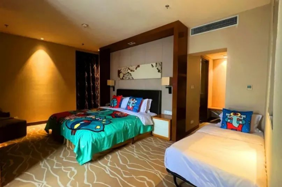 假日酒店亲子房,像把五彩缤纷的世界呈现在眼前,身在其中仿佛进入到心中幻想的童话世界。无论从墙壁、床、卫生间到抱枕,都经过了精心的设计,配上憨态可掬的公仔玩具,让小朋友爱不释手。