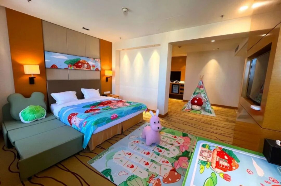 特色主题亲子房,“动物城”和“蘑菇屋”都是小朋友喜欢的色彩,房间配备的玩偶公仔都是小朋友们最亲密的伙伴,一进入房间,仿佛在丛林中探险,钻入精心准备的帐篷,好像进入自己小小的世界,充满奇幻色彩。