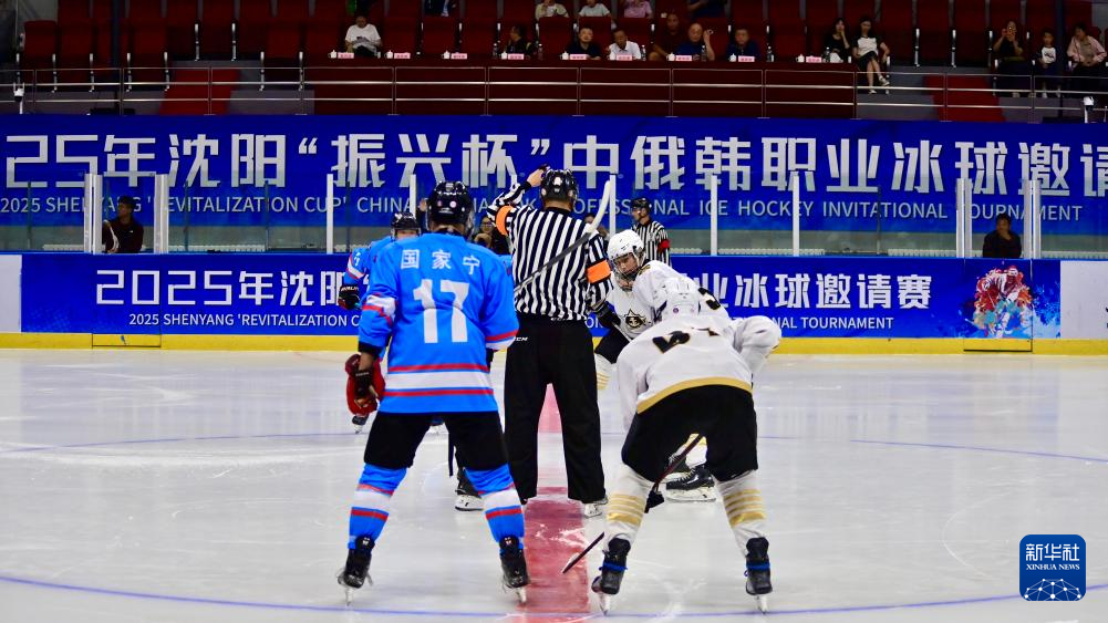 8月27日,深圳昆仑鸿星队和俄罗斯海军上将队球员在2025年沈阳“振兴杯”中俄韩冰球邀请赛揭幕战中开球(资料照片)。 新华社记者 吴青昊 摄