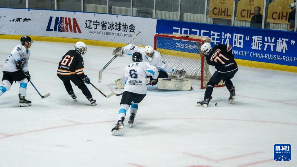 辽宁沈阳奥美职业冰球俱乐部球员(白)在2025年沈阳“振兴杯”中俄韩冰球邀请赛中。最终辽宁沈阳奥美职业冰球俱乐部获得邀请赛冠军(资料照片)。 新华社发