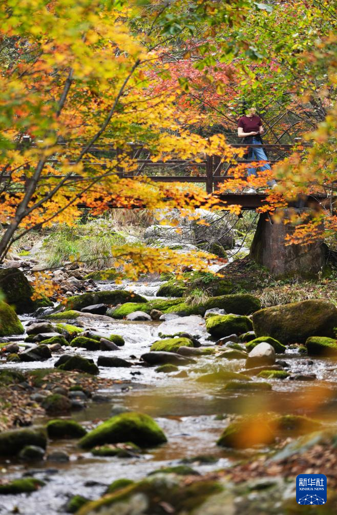 国庆假期,辽宁本溪老边沟风景区内的枫叶五彩斑斓,进入观赏期,吸引游客观景游玩。
