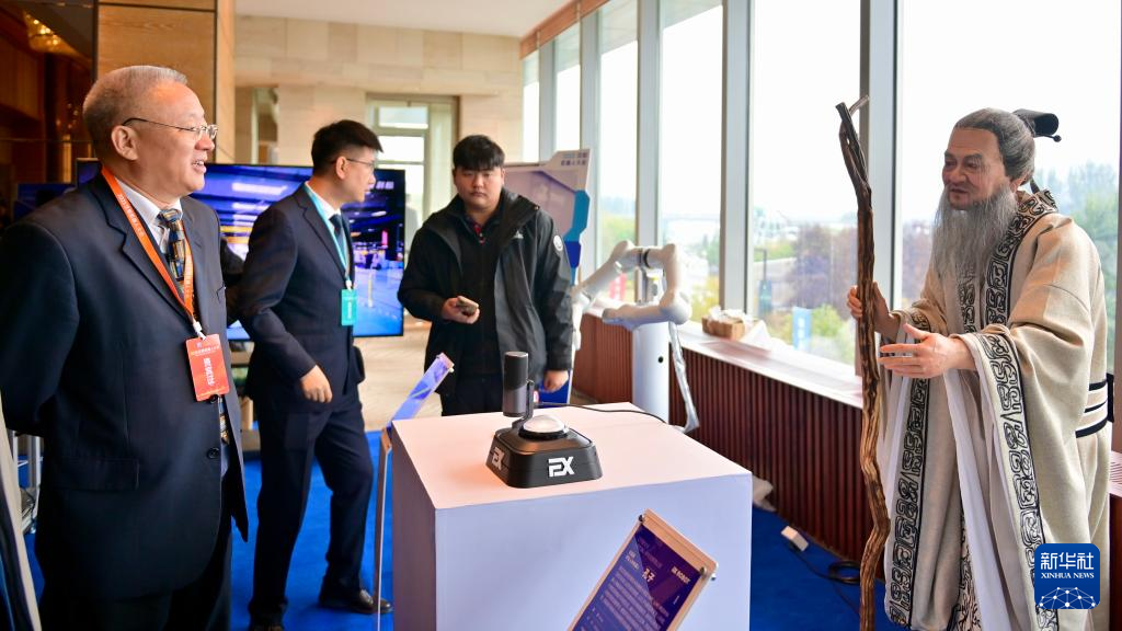 10月17日,一名参会嘉宾在沈阳新次元人形机器人研究院有限公司展台与交互型仿生人形机器人“孔子”互动。新华社记者 吴青昊 摄