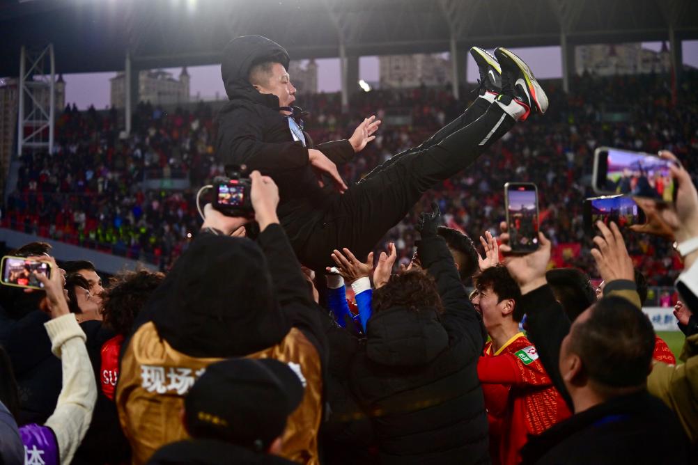10月26日,辽宁铁人队主教练李金羽(上)在赛后被队员抛向空中庆祝。新华社记者 吴青昊 摄