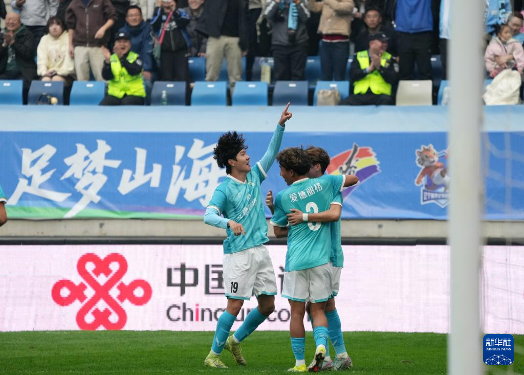 11月15日,大连队球员王跃皓(左)和队友庆祝进球。