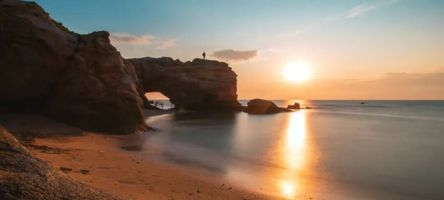 在辽宁团山国家级海洋公园,海蚀地貌、红海滩等自然奇景,与九龙泉、烽火台等历史遗迹,以及古渔船陈列走廊等人文景观交相辉映,让海岸风光与春日景致相映成趣。