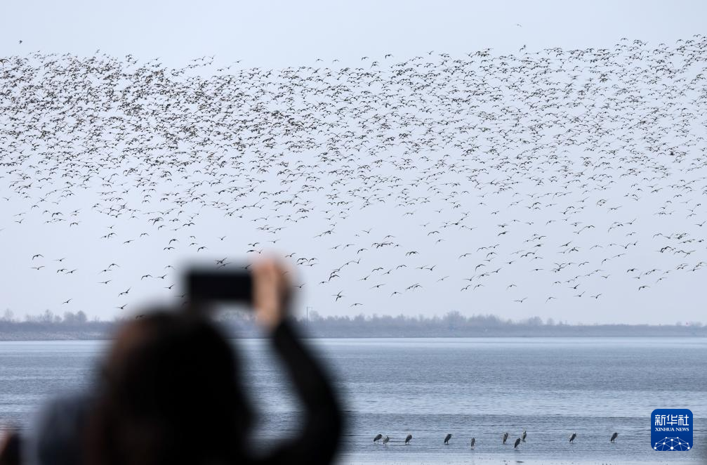 近日,辽宁丹东鸭绿江口候鸟栖息地候鸟翔集,形成“鸟浪”景观,吸引游客前来观赏。