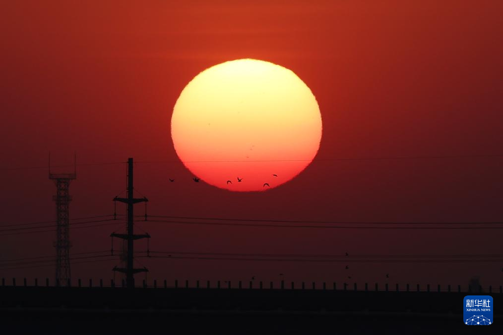 4月2日在辽宁丹东鸭绿江口候鸟栖息地拍摄的朝阳与飞鸟。