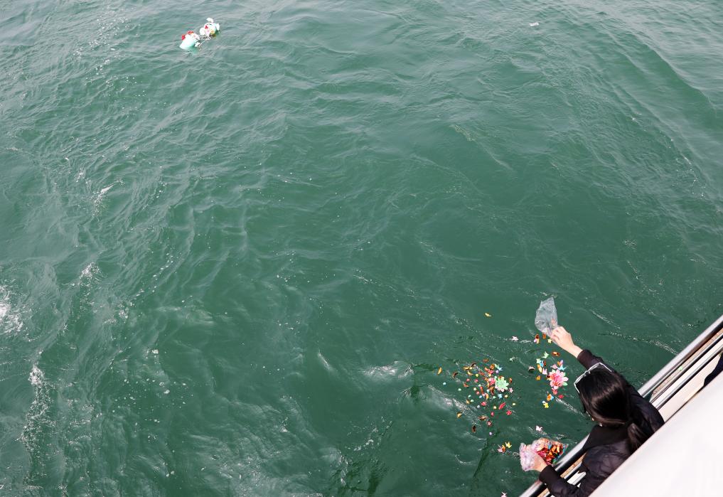 海葬仪式上,逝者家属向海中抛撒折纸鹤、折纸花等,寄托哀思(3月29日摄)。