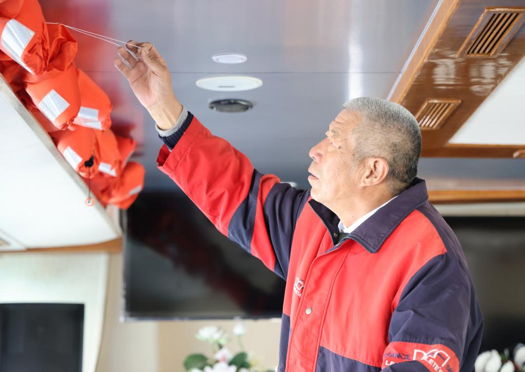 出海前,陈琦照例检查海葬船的安全细节(3月29日摄)。