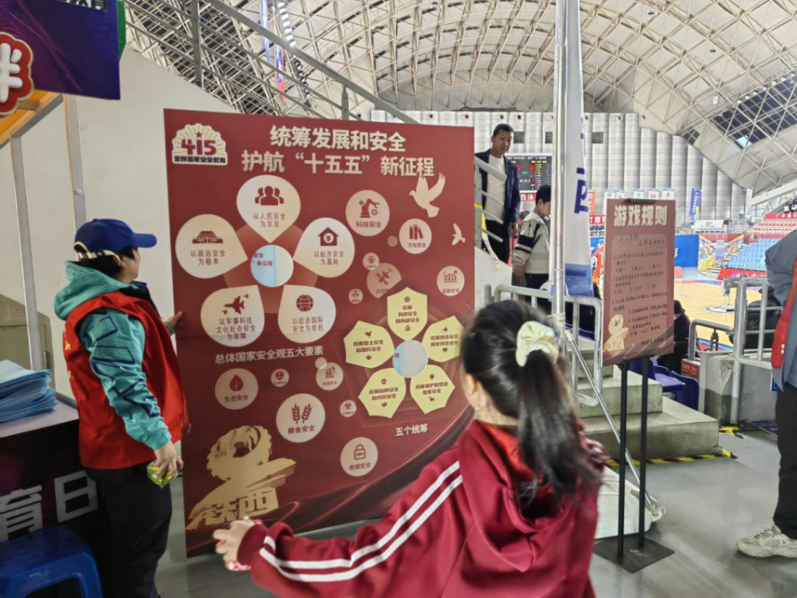 现场设置了三大功能区,静态展示区通过主题展板,解读总体国家安全观的核心内涵和发展历程;互动打卡区的创意背景板将篮球与国家安全元素充分结合,吸引观众驻足拍照、打卡分享;人气最高的是动态参与区,“定点投掷沙包”趣味游戏前排起了长队,参与者只需正确回答一道国家安全知识选择题,即可获得投掷机会,赢得文创礼品。