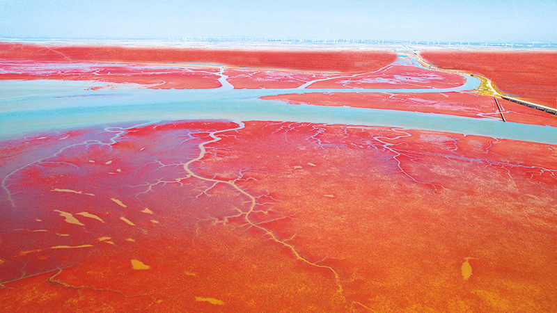 潮涨蓝是海,潮落红接天。夏日里,在凌海市小凌河口湿地,一望无际的碱蓬草在滩涂上如红毯一般铺展开来。站在凌海大桥俯瞰,一片火红的海洋延伸至天际线,与蜿蜒曲折的海潮沟共同描绘出一幅壮阔的画卷……