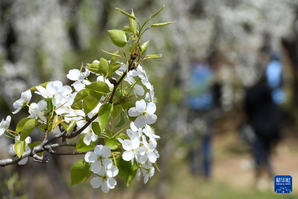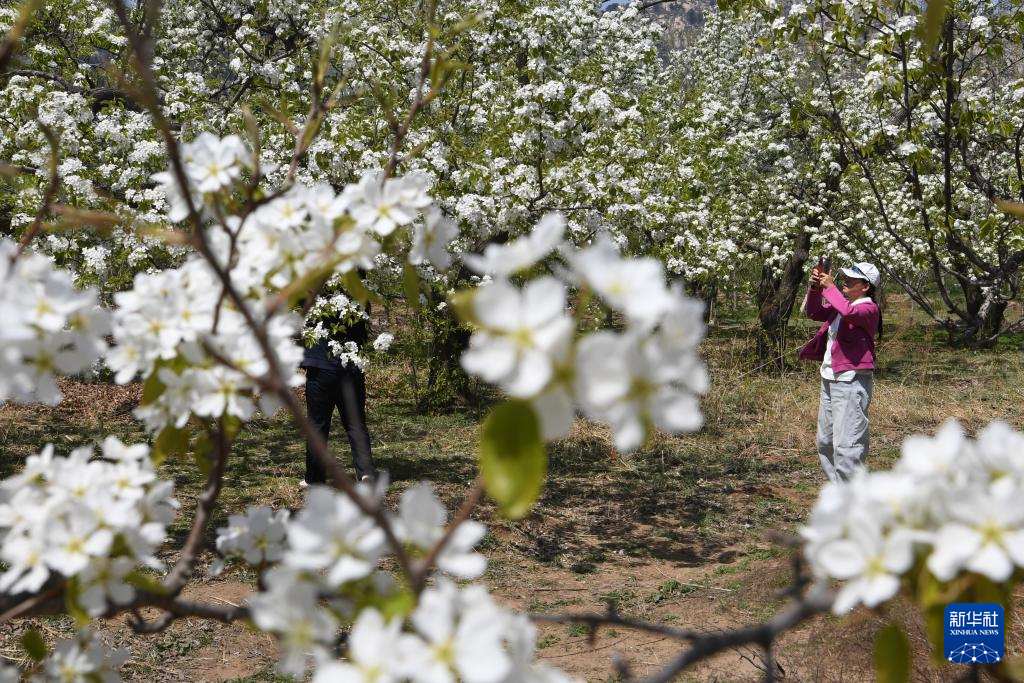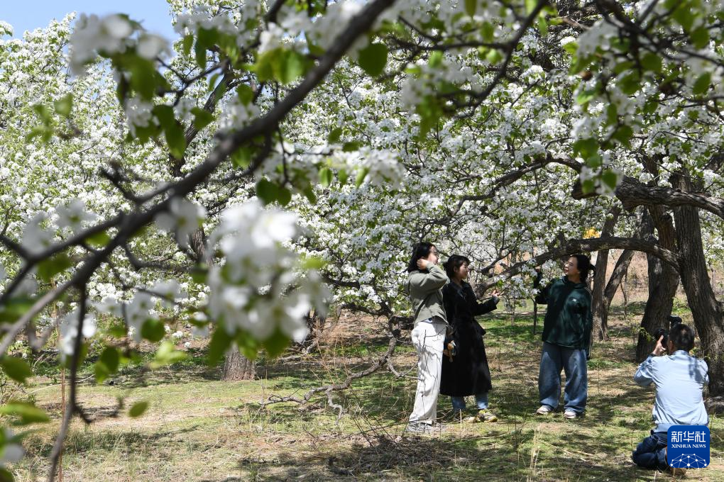 4月23日,游客在北镇市罗罗堡镇河洼村梨园赏花游玩。