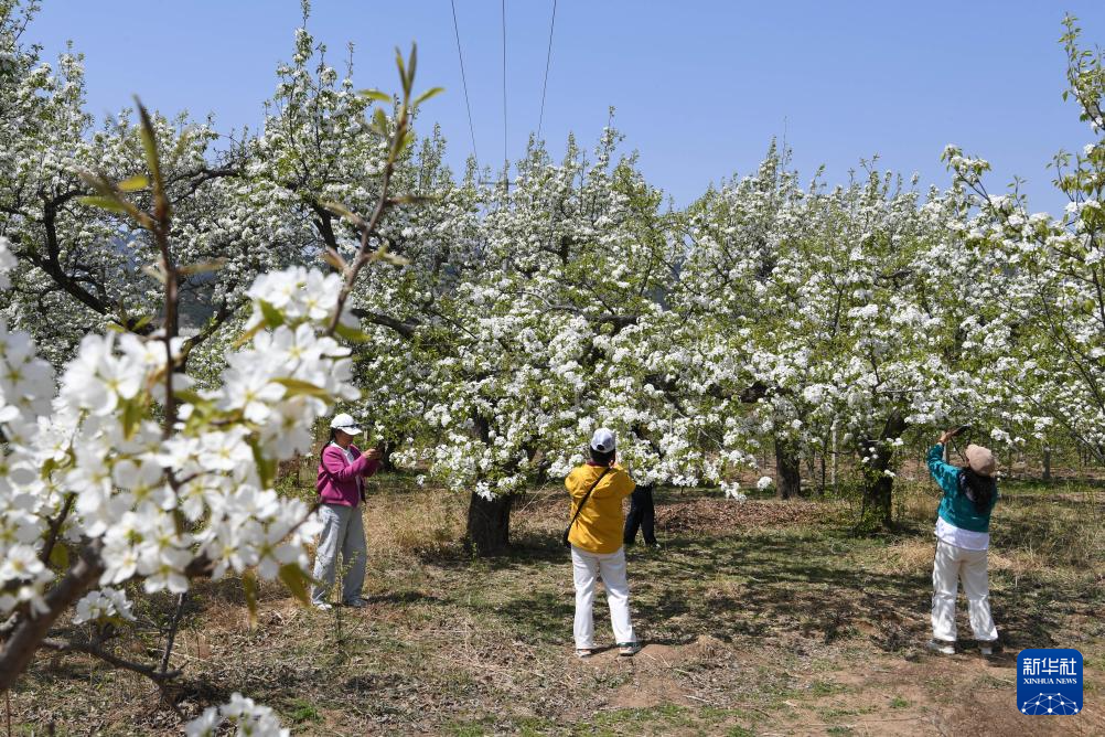 4月23日,游客在北镇市罗罗堡镇河洼村梨园赏花拍照。