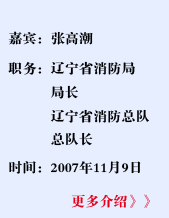 | [张高潮]大家好。在“11.9”消防宣传日,很高兴和大家一起探讨有关消防安全的问题。从辽宁省的消防工作情况看,最近几年,特别是今年以来,在政府的支持下,我们加强了社会监督管理,同时,我们落实了以政府责任制为龙头的消防工作社会化的进程,形成一个“部门依法监管,单位全面负责,群众普遍参与”的格局。? 从全省今年的火灾情况看,应该说比往年有明显好转。到现在为止,全省共发生火灾8200多起,比去年同期下降55%;死亡73人,比去年同期下降45%。总体火灾形势相对稳定。 |