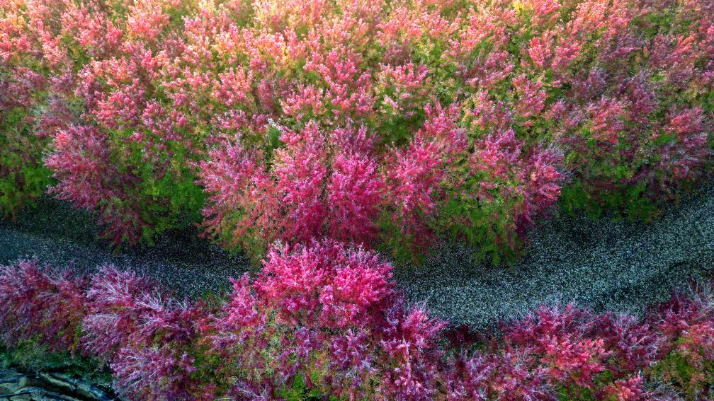 ↑2024年10月16日拍摄的辽宁省沈阳市浑南区王滨街道富家屯村红枫林秋景。(无人机照片)CICPHOTO/黄金崑 摄