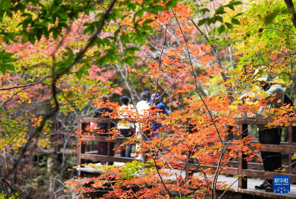 国庆假期,辽宁本溪老边沟风景区内的枫叶五彩斑斓,进入观赏期,吸引游客观景游玩。