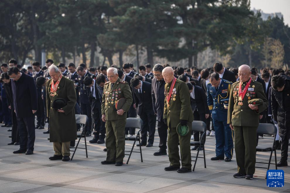 10月25日,志愿军老战士在沈阳抗美援朝烈士陵园仪式现场默哀。