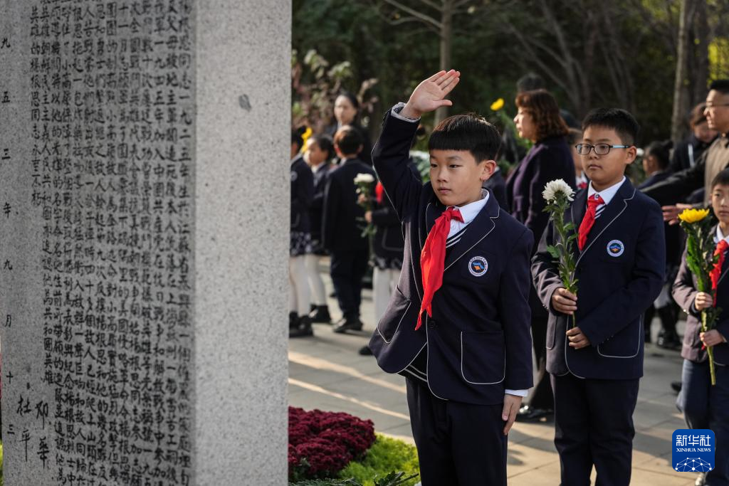 10月25日,小学生代表在沈阳抗美援朝烈士陵园仪式现场向烈士墓敬礼。