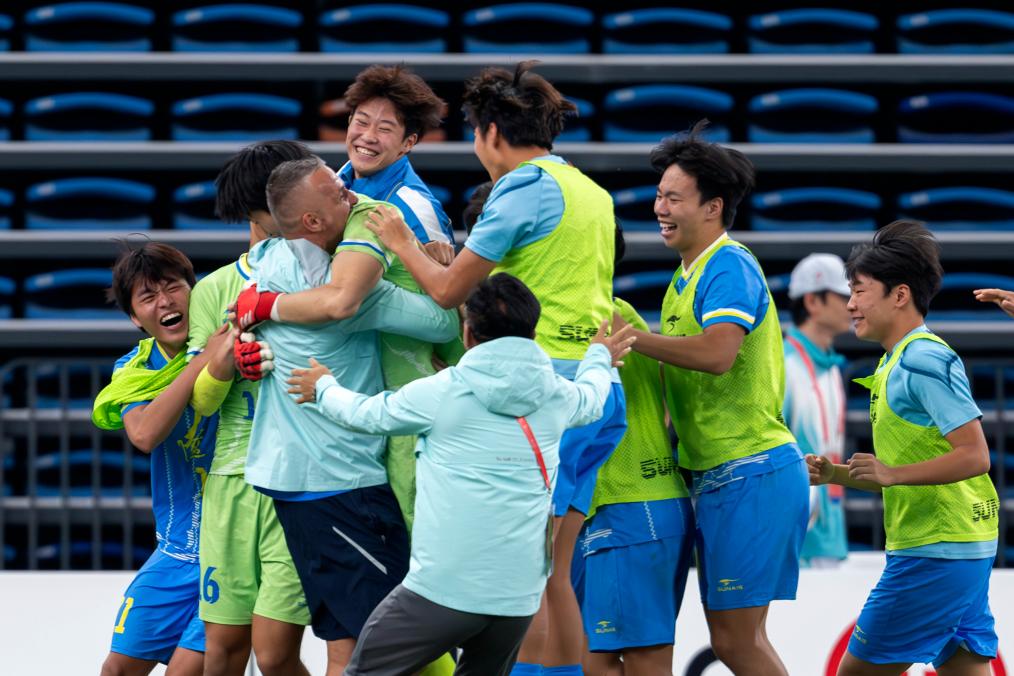 10月26日,辽宁铁人队主教练李金羽(上)在赛后被队员抛向空中庆祝。新华社记者 吴青昊 摄