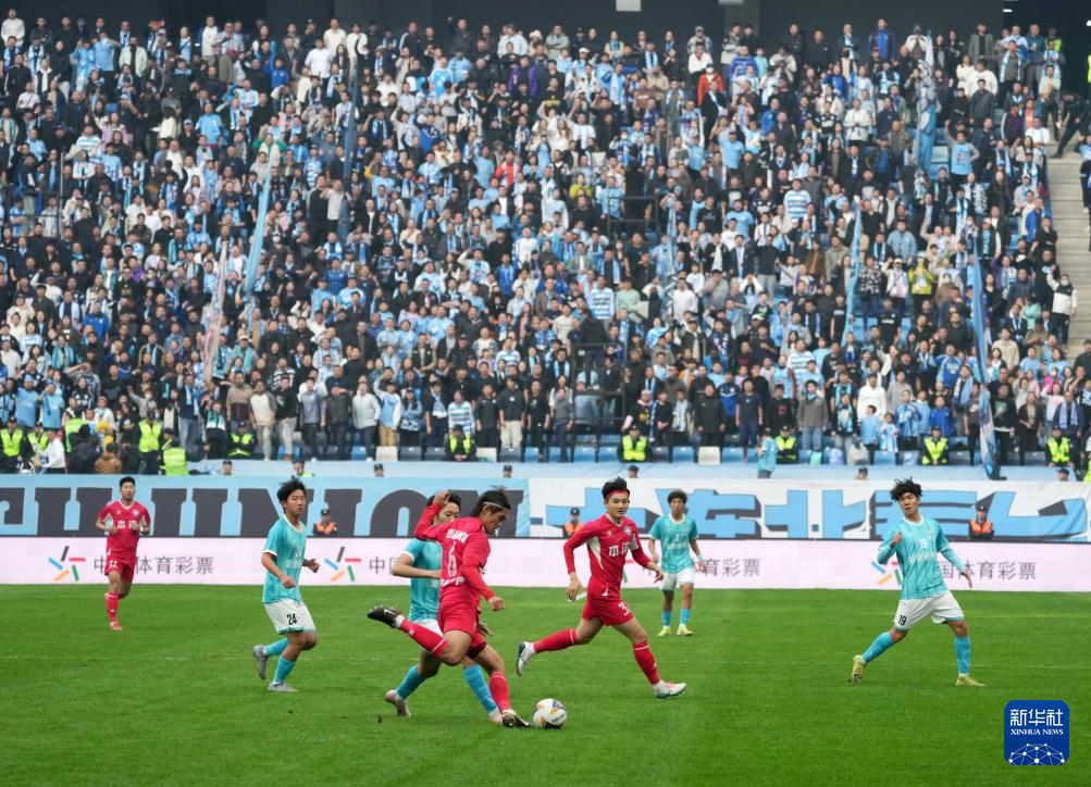 11月15日,大连队球员王跃皓(左)和队友庆祝进球。