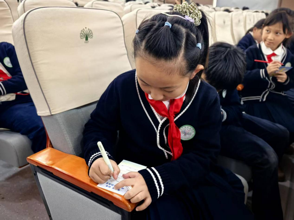 四年级学生王智宸在日常学习生活中展现了美术的特长,学校就以王智宸的美术作品展示为主题举办了这场活动,其间,还设置了全员参与的诗朗诵、大合唱等环节。活动中,全体学生都在“优点卡”上写下身边同学的优点,并投入“闪光发现箱”。王智宸所在班级的班主任姜波说:“我们鼓励所有同学像王智宸一样,勇敢地去发现、坚持自己的热爱,成为最好的自己。”