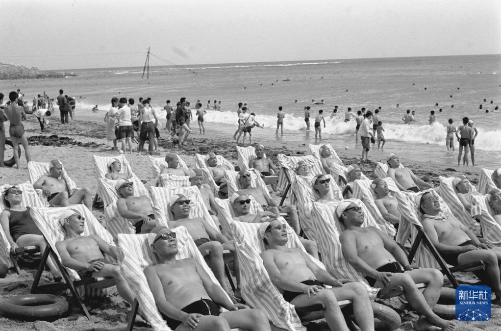 1979年,人们在大连的海边晒日光浴。新华社记者 姜可运 摄