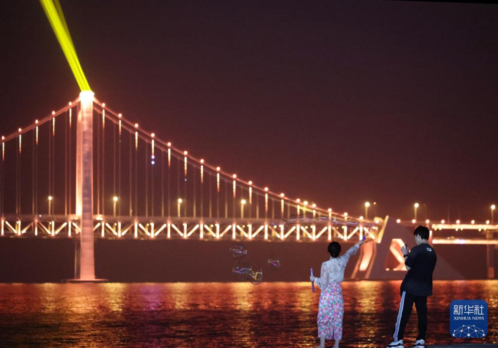 2024年5月23日,游客观赏大连星海湾大桥的光影秀。新华社记者 李钢 摄