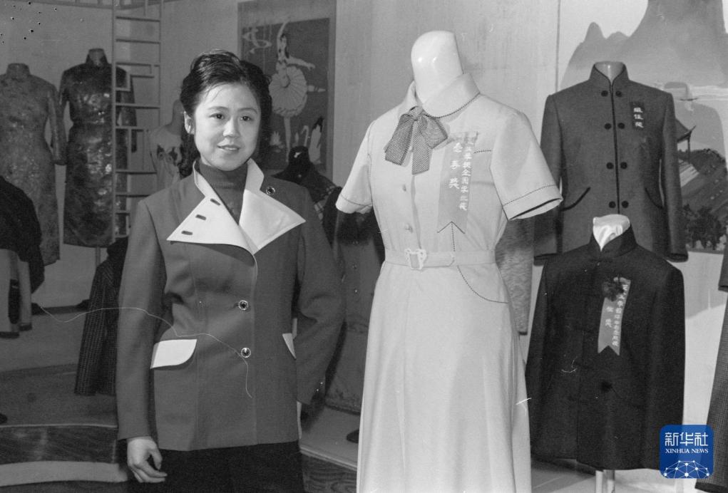 1984年5月拍摄的设计师马丽翠和她设计的女大学生连衣裙及女上衣(右后)。新华社记者 肖野 摄