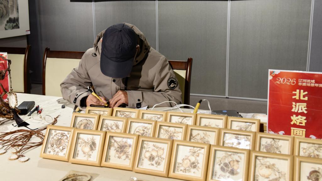 2月3日,一名手工艺人在铁岭博物馆展示北派烙画技艺。