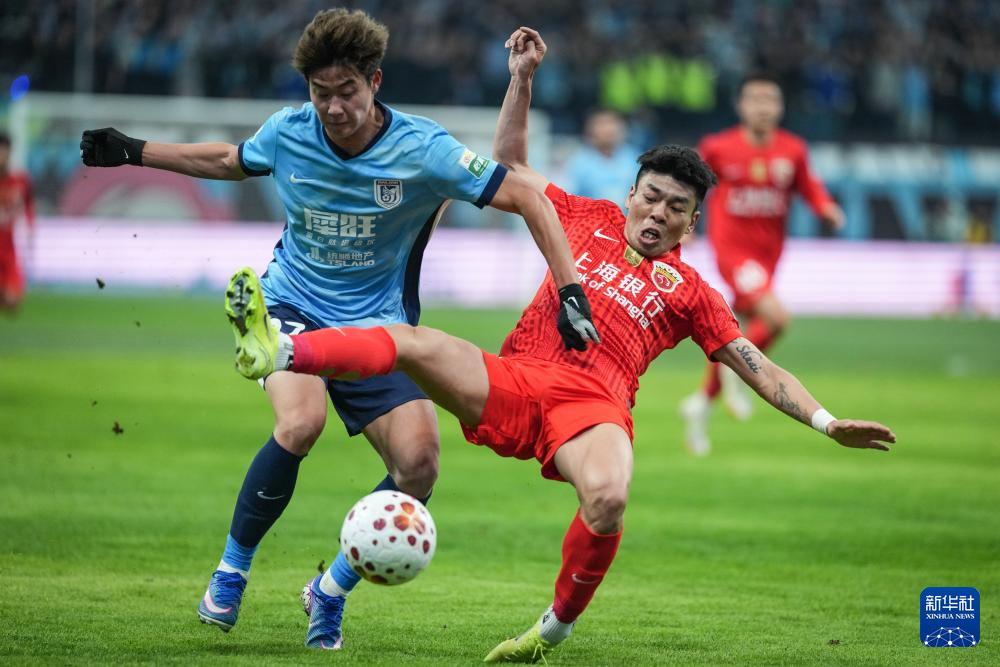3月20日,大连英博队球员杨铭锐(左)在比赛中与上海海港队球员李帅拼抢。