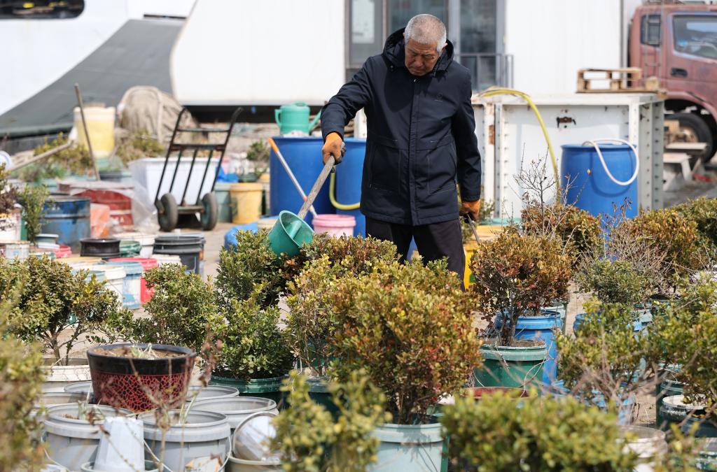 在海葬船专属码头,陈琦给绿植浇水(4月3日摄)。他希望码头上的绿色,能帮助逝者家属缓解情绪。
