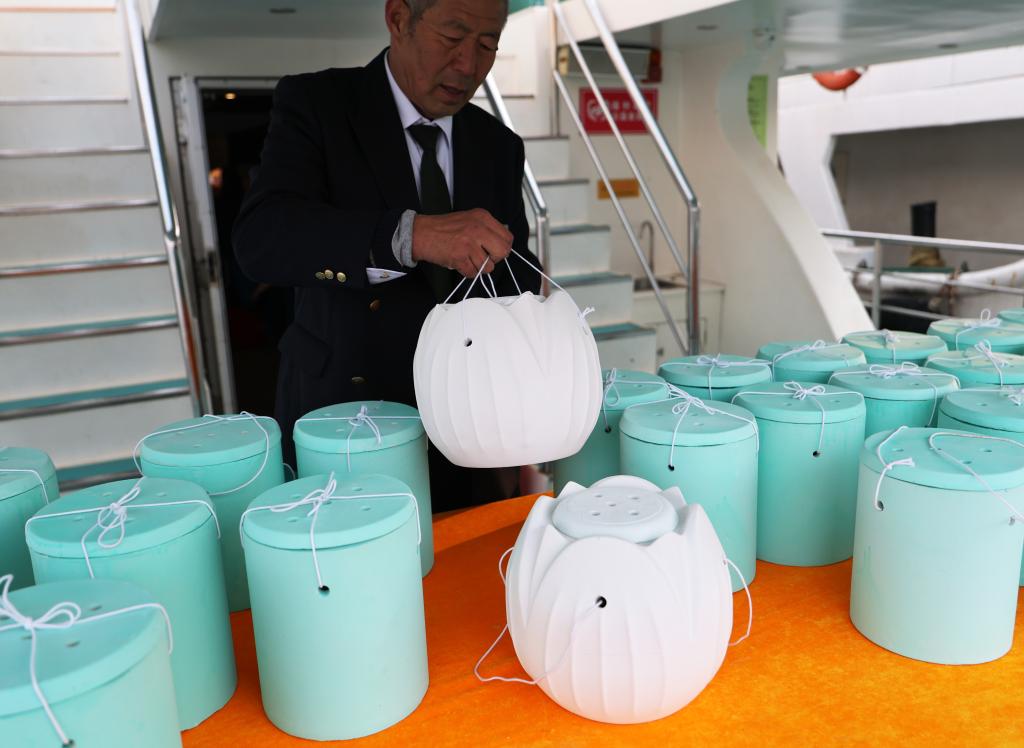海葬仪式上,陈琦团队的工作人员帮助逝者家属给可降解骨灰罐插花(3月29日摄)。