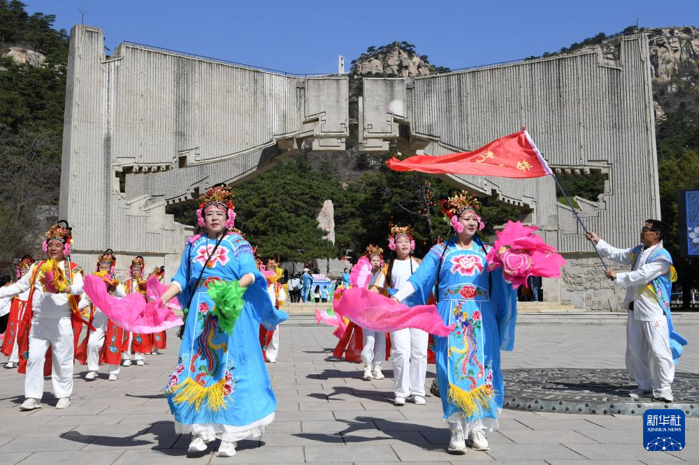 4月23日,在辽宁省北镇市医巫闾山景区,秧歌队表演秧歌舞。